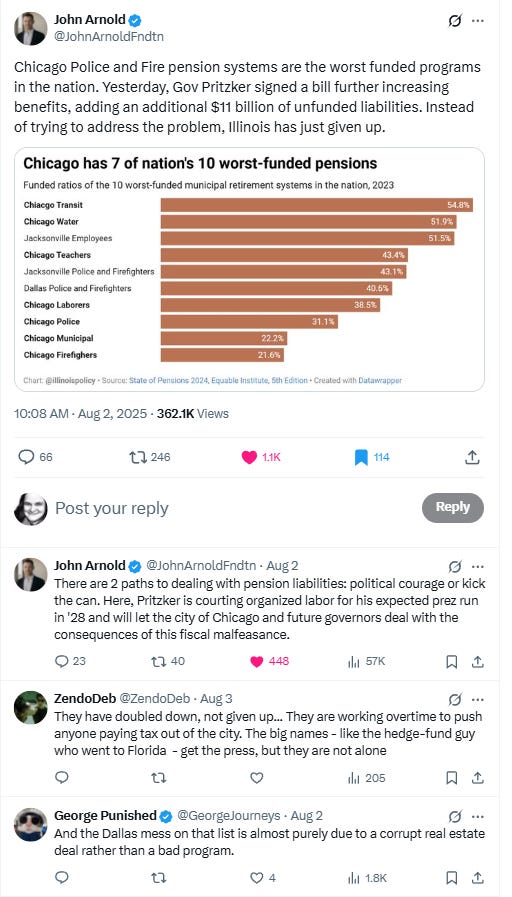 Unsurprisingly, Illinois Gov. JB Pritzker signed the Chicago police and fire Tier 2 pension sweetener, bringing it in line with the downstate plans. However, this is not much of a gift to Chicago… or those pensioners… if those promises are never fulfilled. I look at reactions from the usual suspects: Wirepoints, Austin Berg, Jeffrey Carter, and John Arnold. And, of course, me. There will be text posts forthcoming, if you’re not into audio posts.