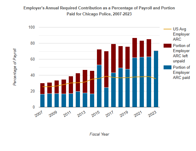 Let me remind you of my prior post on Chicago finances, how well the city has been making contributions to the police and fire pension funds of late:
