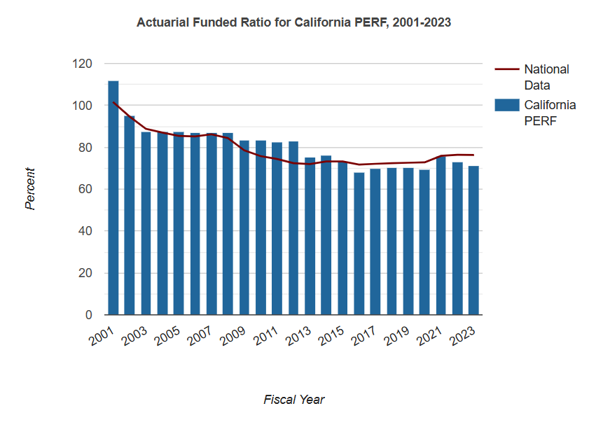 Every year, the “required” payments are made, and every year, they’ve just slowly deflated in funded ratios. Yes, some of it is the result of lowering the discount rate used to value the liabilities. CalPERS went from 8.25% in 2001 to 6.8% in 2024. That does make a difference.