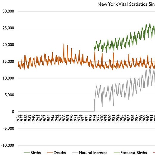 These were the week-by-week total deaths in New York City. The dashed line is the “expected” number of deaths — remember my baseline mortality post?