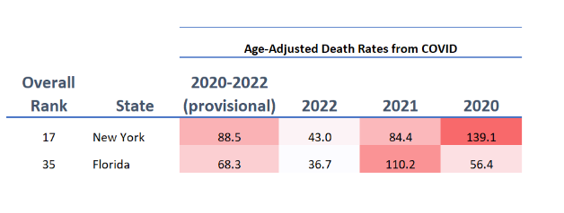 Now, you may say, “Hey, that scale doesn’t let us distinguish between Florida and New York very well!”, and you would be correct. I’m about to give you numbers for the years, with the age-adjusted death rates for COVID for those two states.