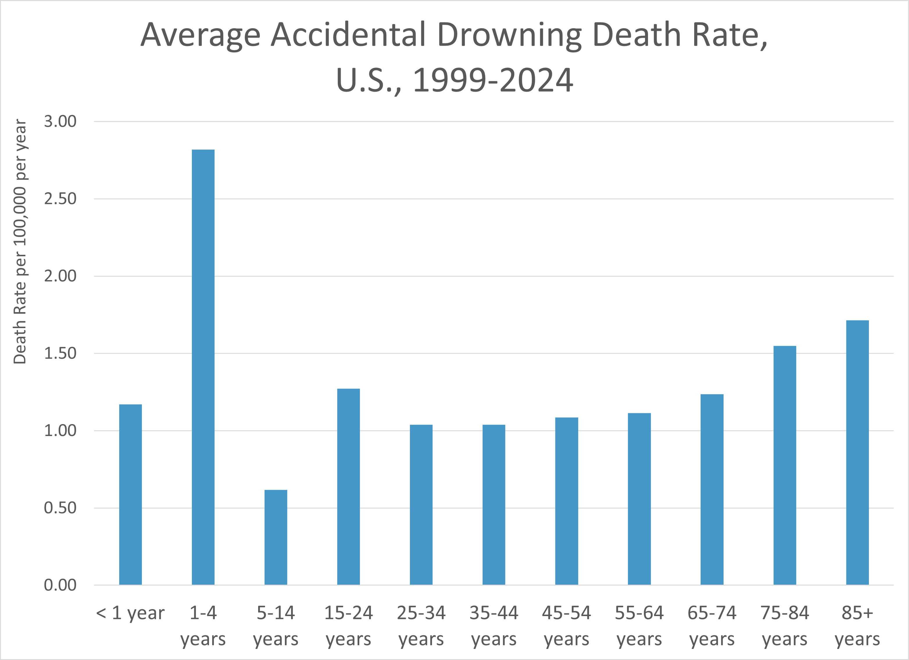 But we cannot simply look at the raw numbers — these groups are not all the same sizes, to be sure. There is a reason the “ten year age groups” aren’t 10 years for infants and 1-4 years. There are some special results within those groupings, and drowning among infants and toddlers are those things.