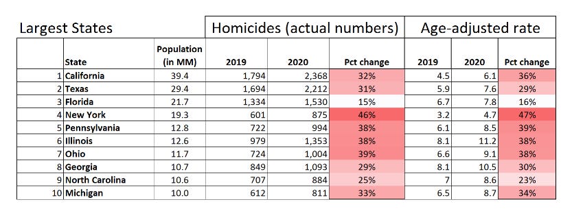 So Florida didn’t have much of an increase in homicides, many of the large states had increases near the nationwide average increase of 30%, and then some of them had very large increases — like New York. An almost 50% increase.