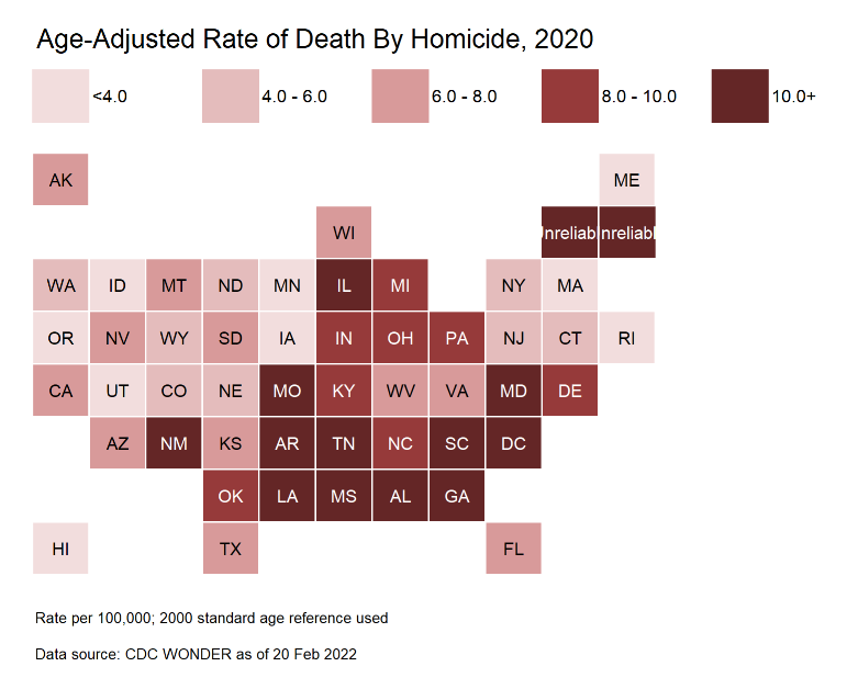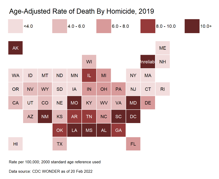 I know it’s hard to see, but Vermont says “Unreliable”. In some years, the low population states had very low numbers of homicides (VT being the lucky state in 2019), and the confidence intervals for the rates are too broad to get a statistic you can do much with.