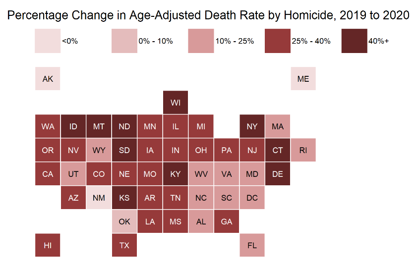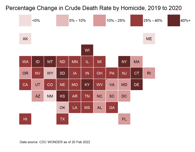 As a reminder, age-adjusted death rates for homicide increased 30% between 2019 and 2020, which is the largest single-year increase going back through 1968. The second-highest year was 2001, which had an increase of 20%, due to the September 11th terrorist attacks. So this was worse.