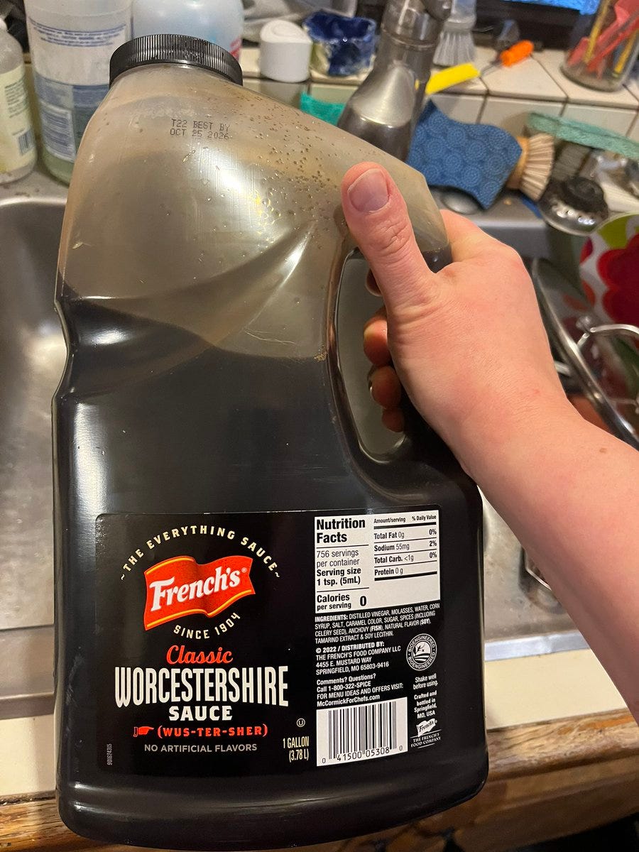 As I do, I ordered a gallon of Worcestershire sauce for when my middle child came to visit…
