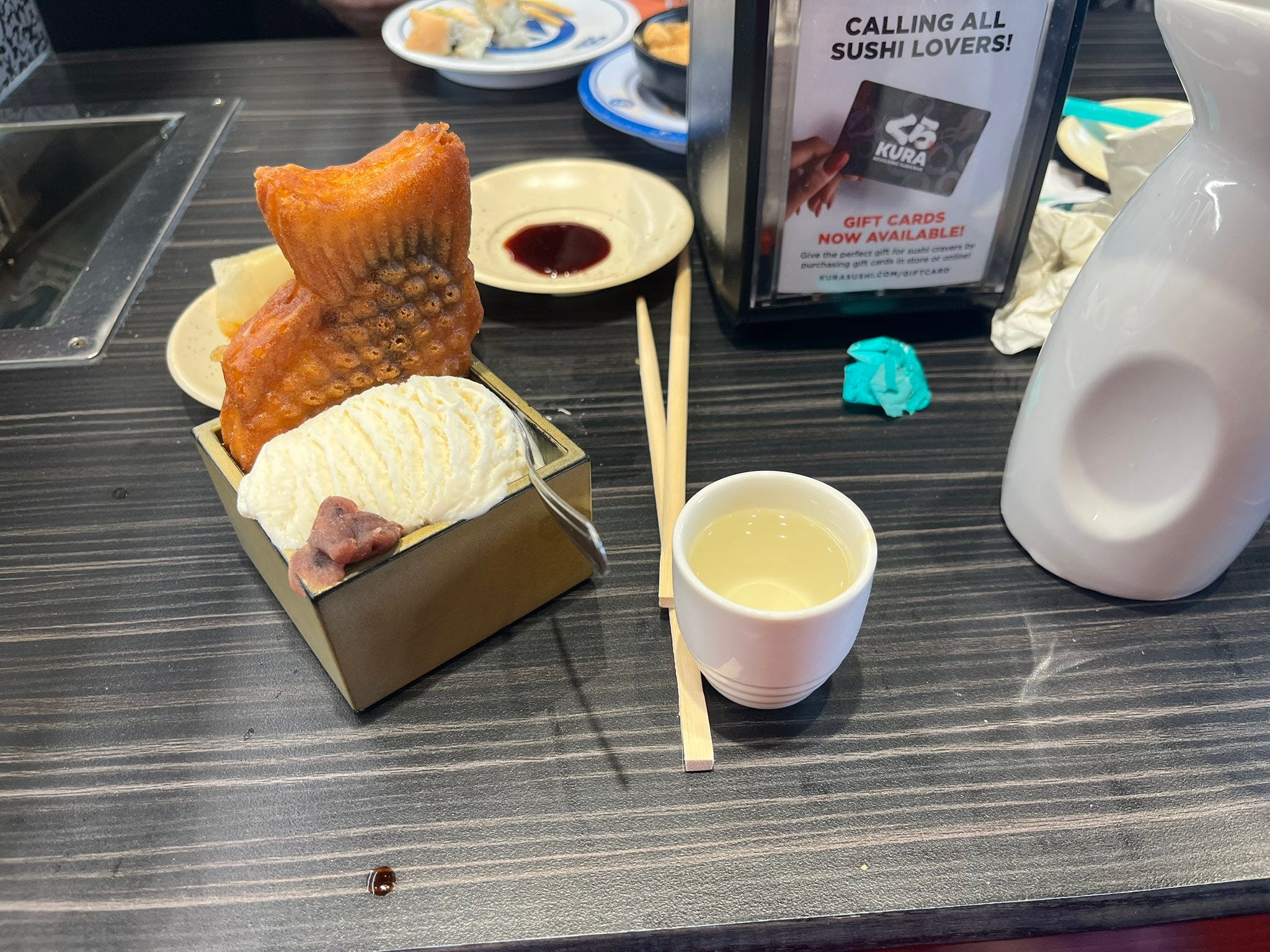 Taiyaki is this fried/baked cake, made with a pancake or waffle-type batter in a fish-shaped mold, and it’s filled with red bean paste. You can see a dab of the adzuki bean paste next to the ice cream. They serve it hot from the “pan”, and it’s great with ice cream.