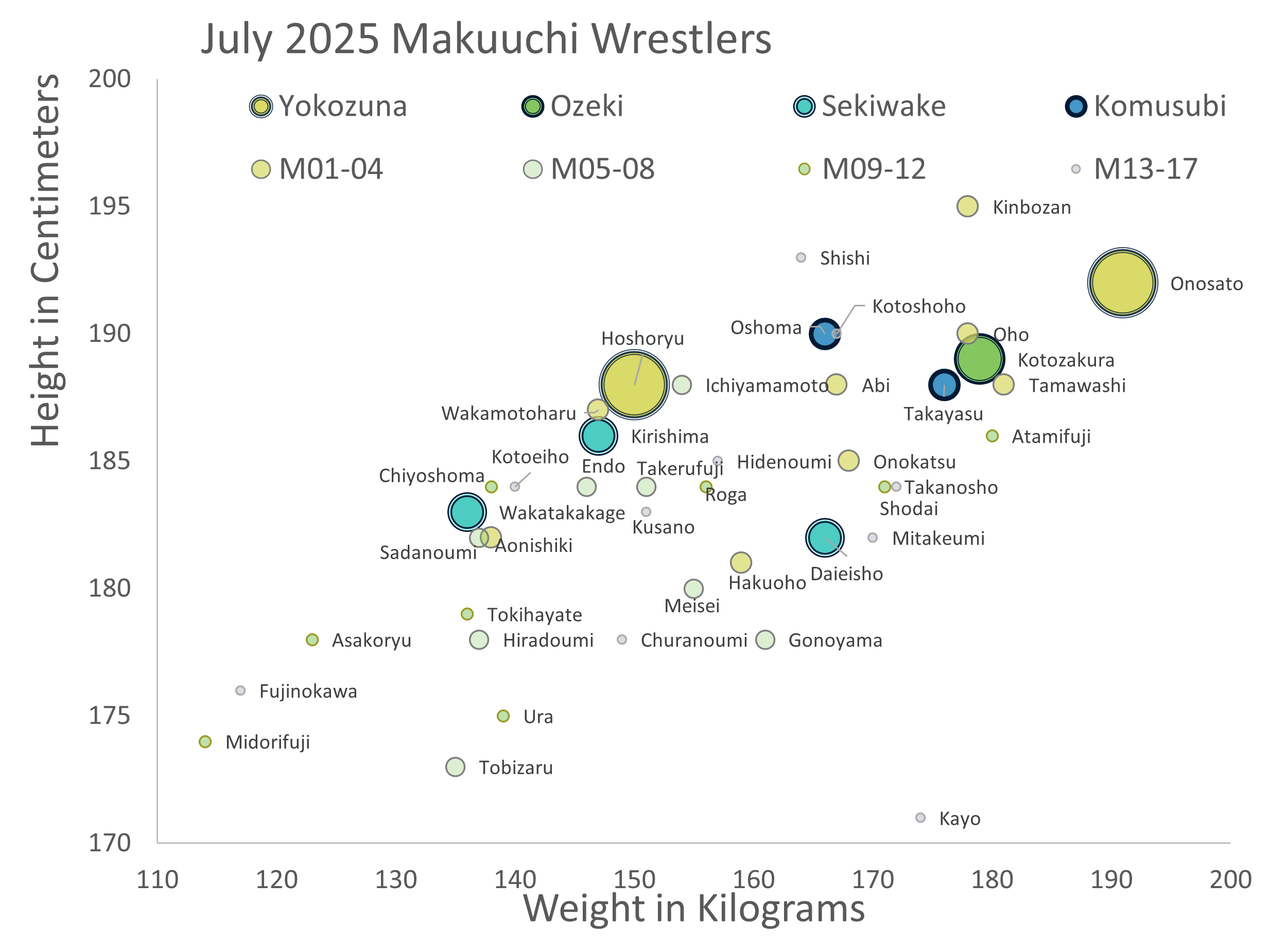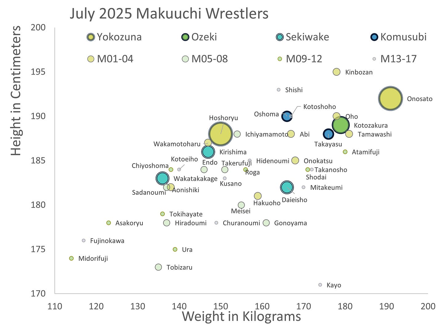 There are no weight classes in pro sumo, which is why my weight-height scatterplot for the top ranks looks like this: