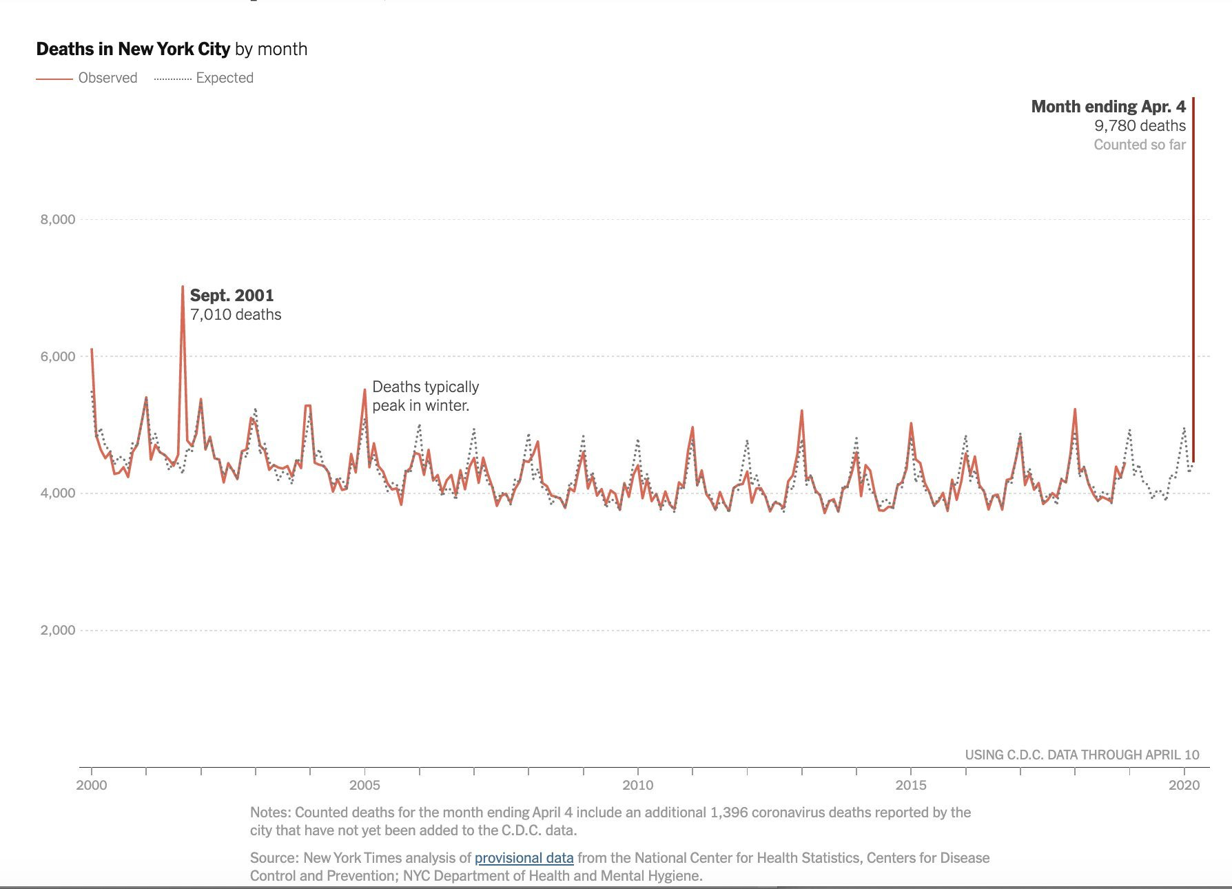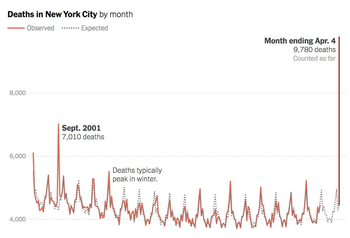Here are two versions of the same graph, showing total deaths in New York City, by month, going back to 2000. The first is a cropped version, and the second is the full version, as it ran in the New York Times. The cropped version was on twitter.