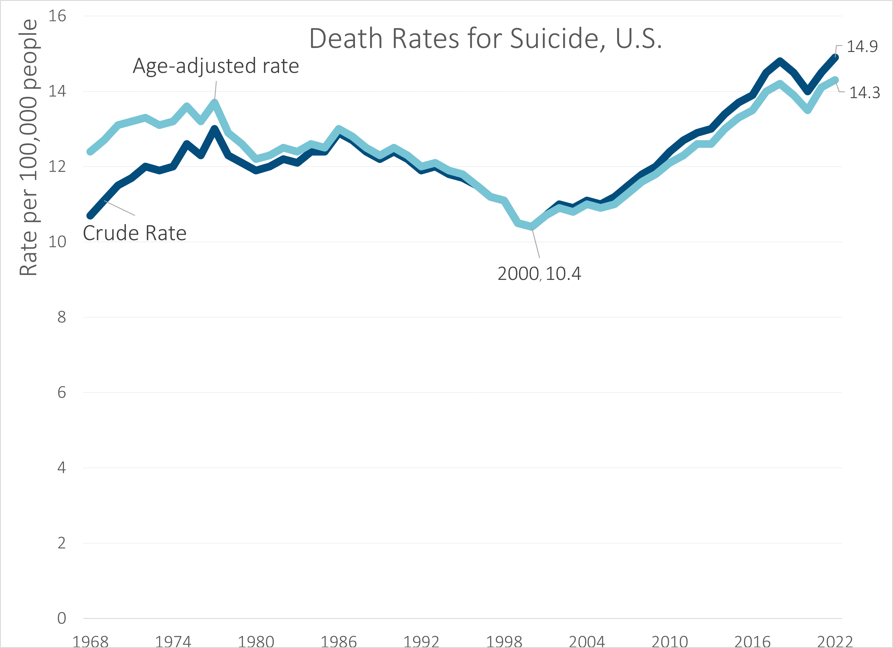 The crude rate (total number of deaths via suicide per total population) and the age-adjusted rate (a rate to normalize for the age distribution of deaths and population) have similar trends.