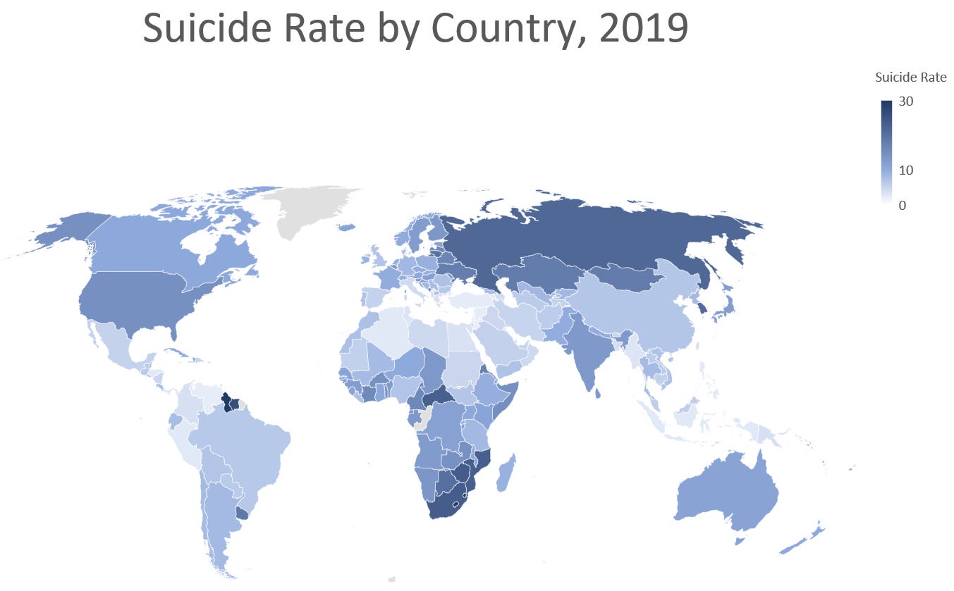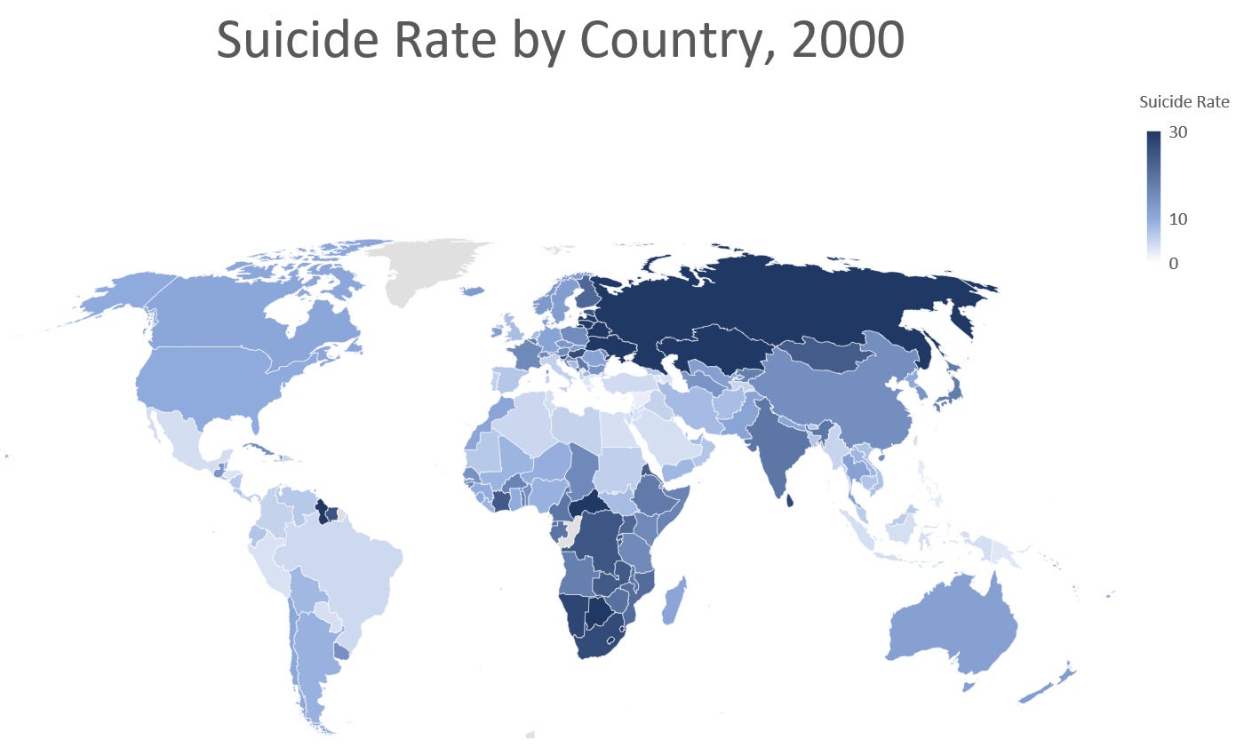 First — what the hell, Lesotho? I have no idea what is going on there. Evidently, it’s one of the only places in the world where the female suicide rate is higher than that of males. I seriously do not know what is going on there.
