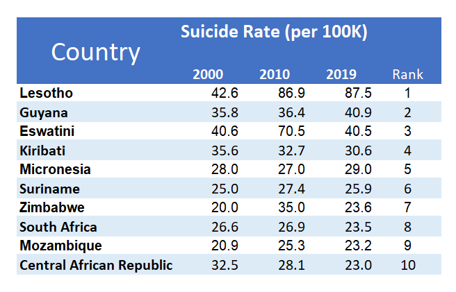 Eswatini - I hadn’t even heard of the place before. (Okay, it used to be called Swaziland, and I had heard of that.) But what is with the big spike of suicides in 2010?