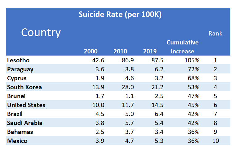 Next, the top countries for the increase in suicide rates, which will look different… kind of.